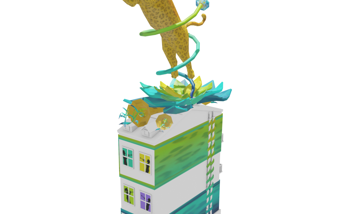 A design for the Carnaval competition 2023, for the Small Townhouse V1 building. The Pantera Onca (jaguar) mainly lives in the Brazilian Amazon, and this magnificent creature dressed up for Carnaval in Rio! Note the (female) trumpet players inside as well.